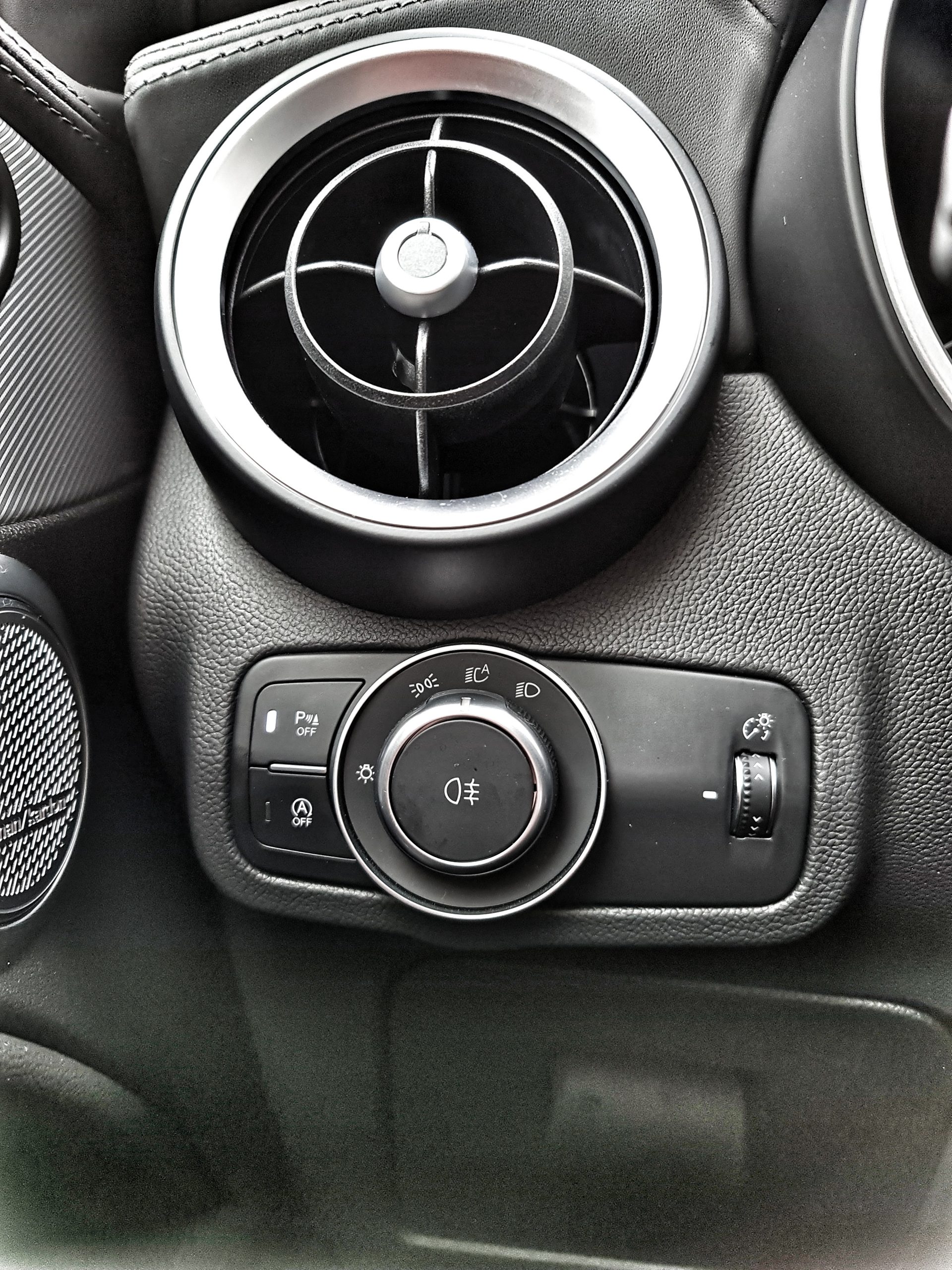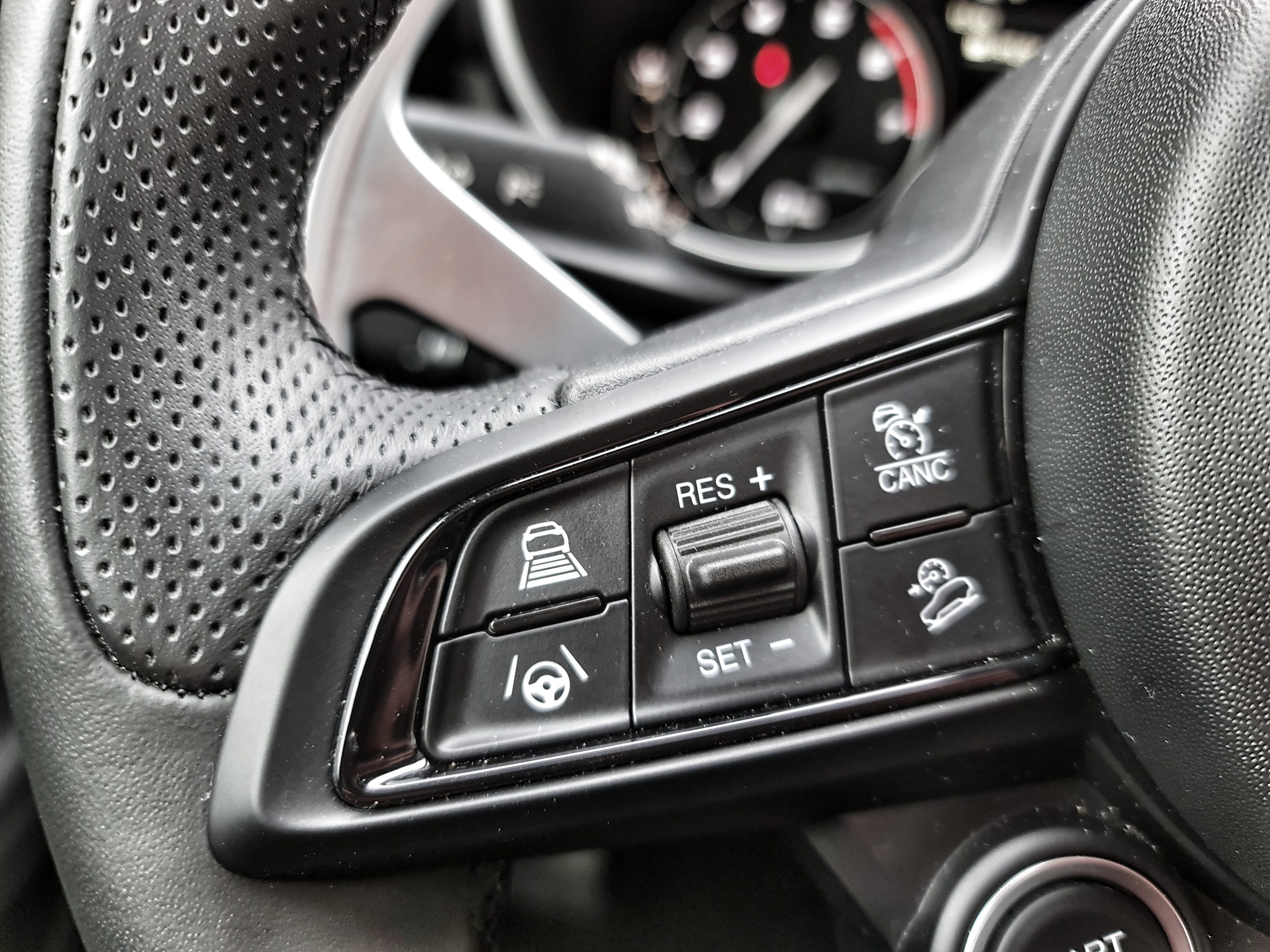 Le levier de vitesses est garni de cuir et est assez simple à utiliser, avec ses déjà classiques « P » « N » « «D »  et  ««R » . En parlant du « R » , des capteurs et caméras vous épaulent dans vos efforts pour se garer. Je ne vais pas mentir, on ne gare pas le Stelvio Veloce comme une citadine qui se faufile sur la place de parking avec la facilité d’une fleur plantée dans une jardinière. Donc, gros avantage d’avoir la caméra qui surveille les alentours de la voiture.