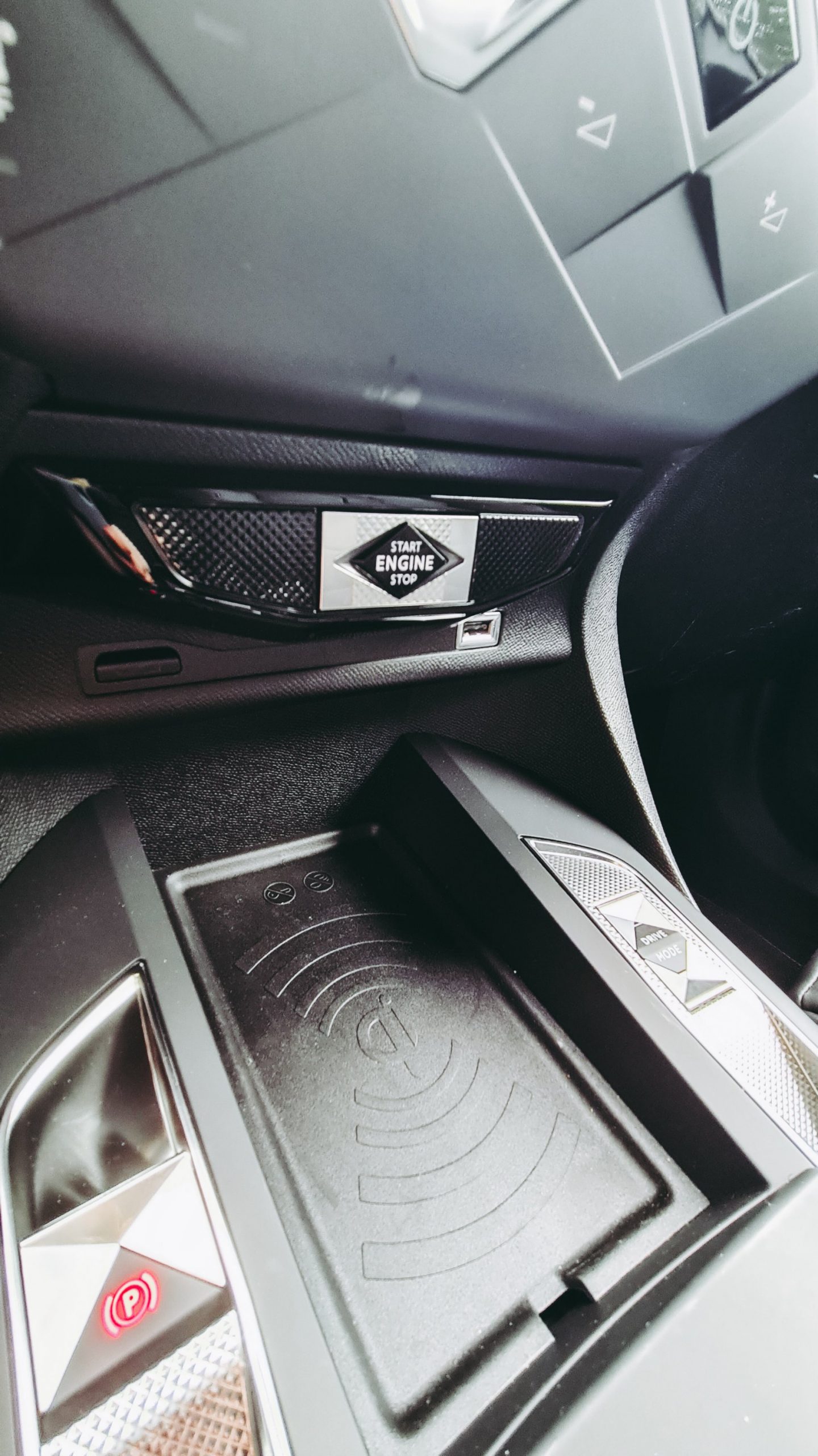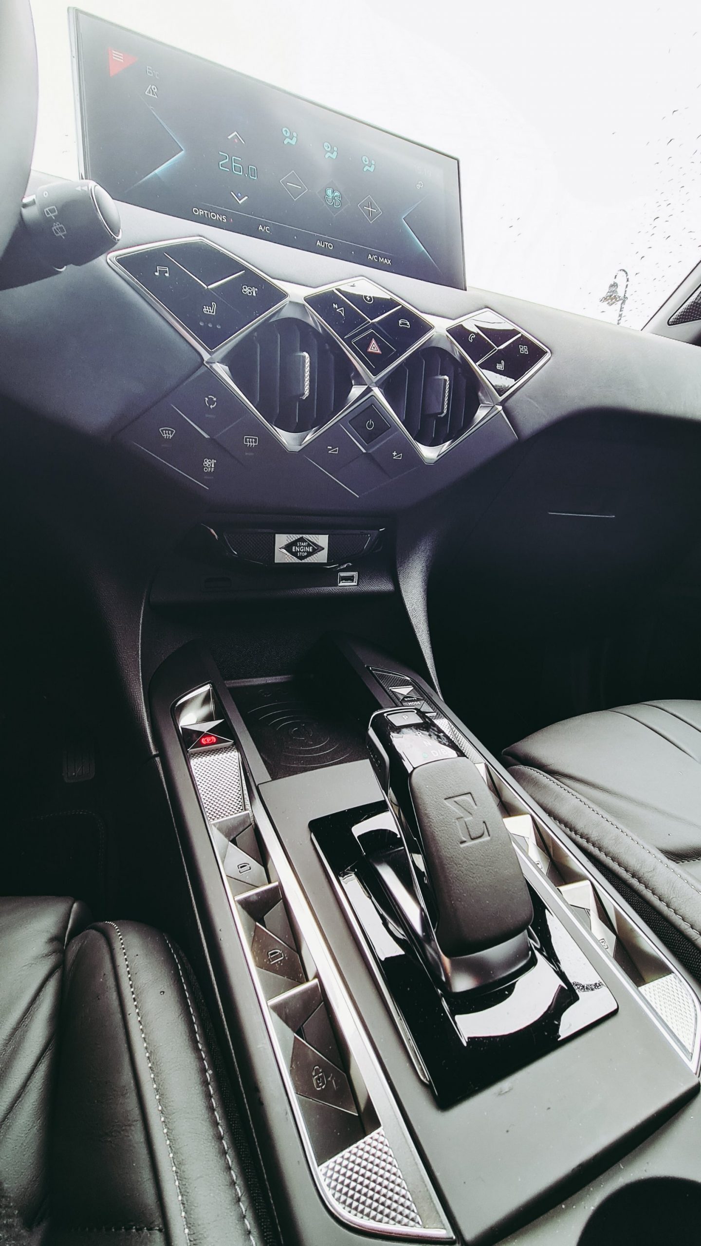 Sous l’écran tactile 10’’3, la façade centrale respire l’ADN de la marque DS: les commandes sensitives et les deux aérateurs centraux prennent la forme de diamants.