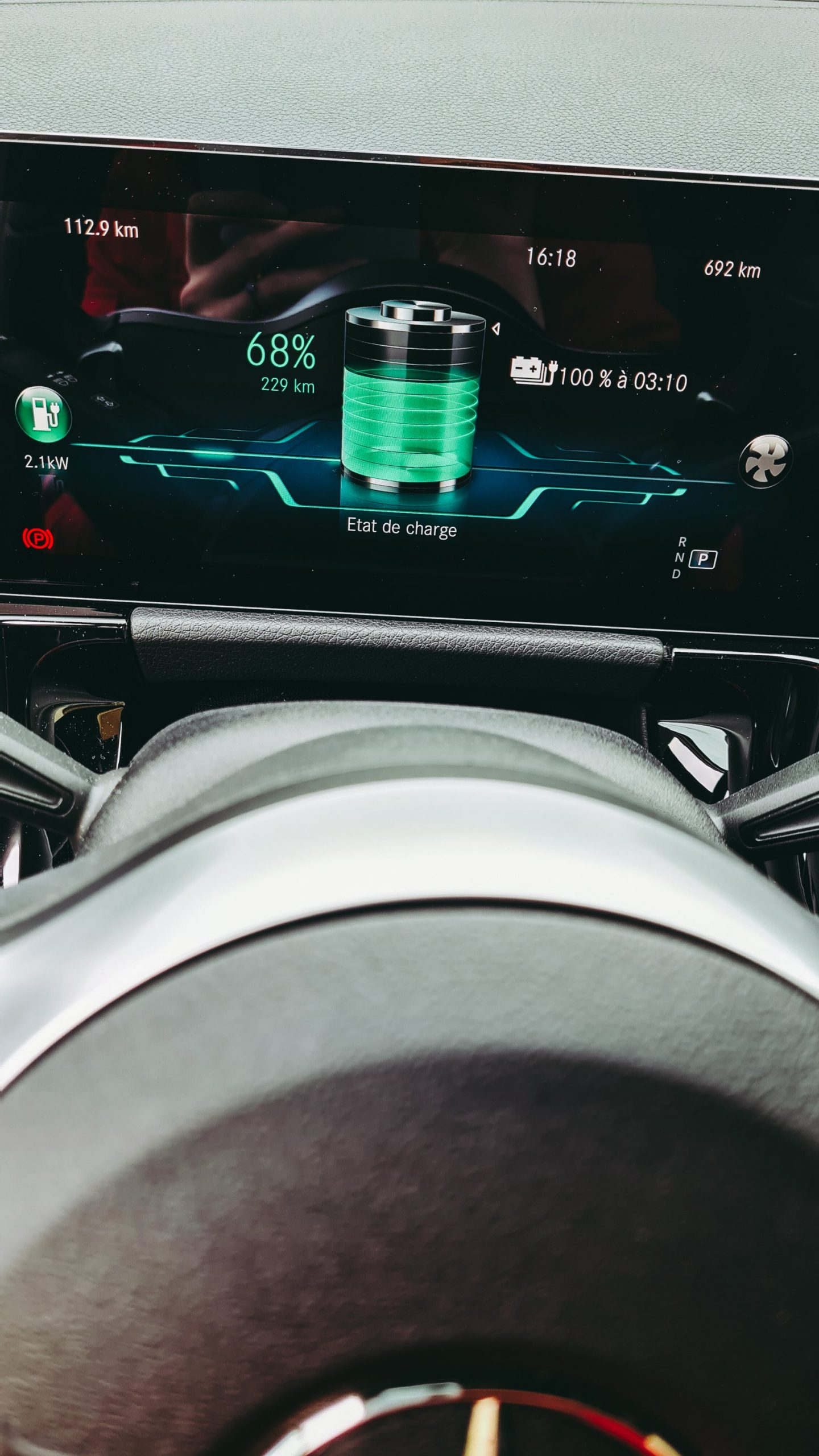 En haut, on retrouve le pourcentage de la puissance demandée et en bas, la récupération d’énergie. A gauche, on peut consulter des informations concernant les potentiels arrêts pour recharger la batterie, si la destination est éloignée. Je trouve que la navigation avec Electric Intelligence est un gros plus, surtout pour les personnes qui ont parfois du mal à s’orienter et à s’organiser dans le trafic.