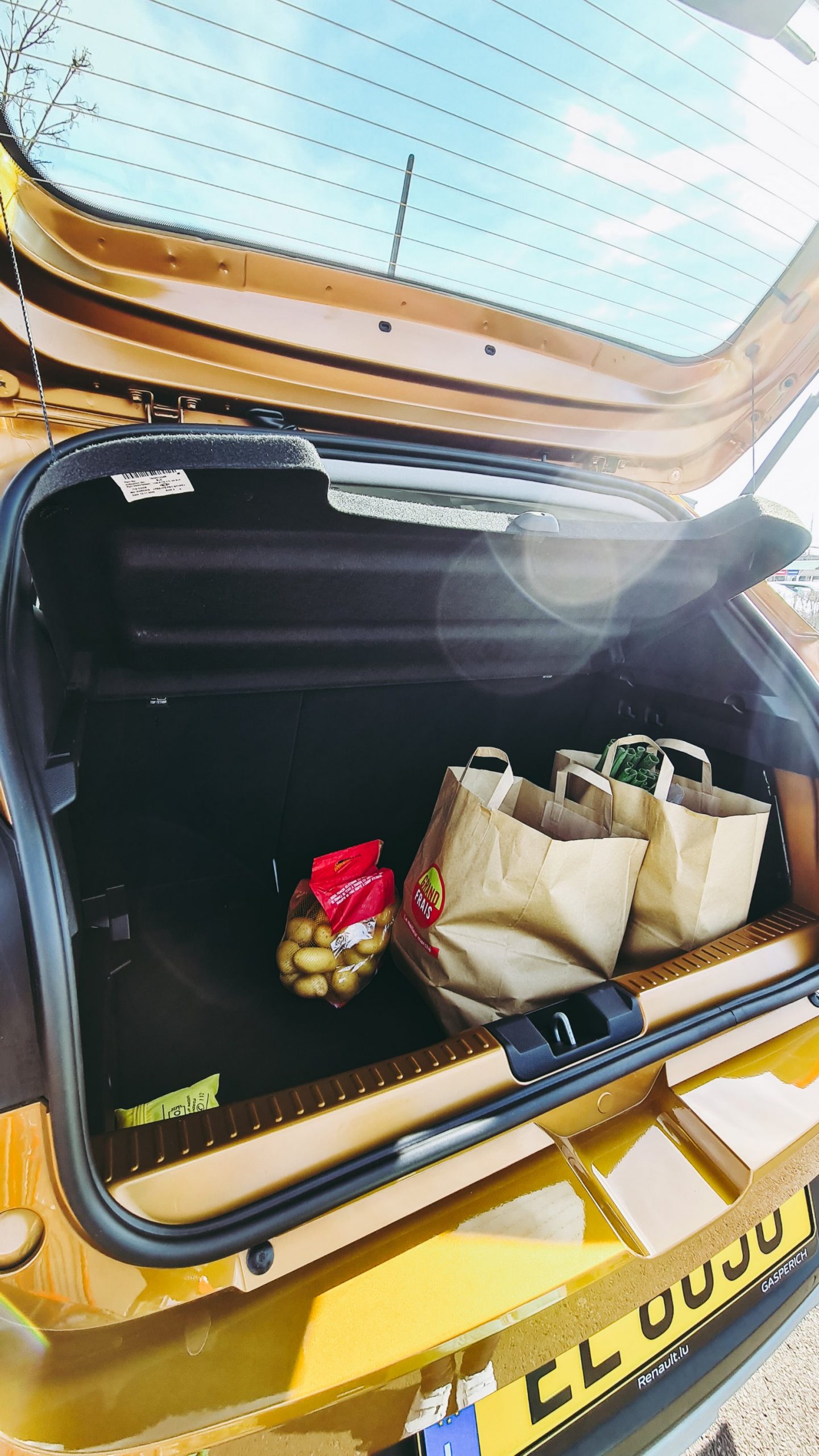Concernant le coffre, j’aime beaucoup sa polyvalence. Les dossiers rabattables de la banquette arrière lui permettent de passer de 410 l à 1455 l. Voici à quoi ressemble la version 410 l du coffre avec mes courses.